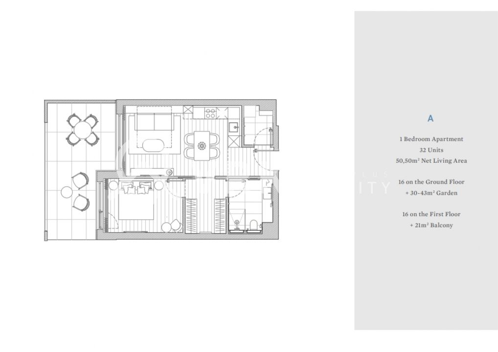 Prízemie: 16 apartmánov so záhradou o výmere 30–43 m²