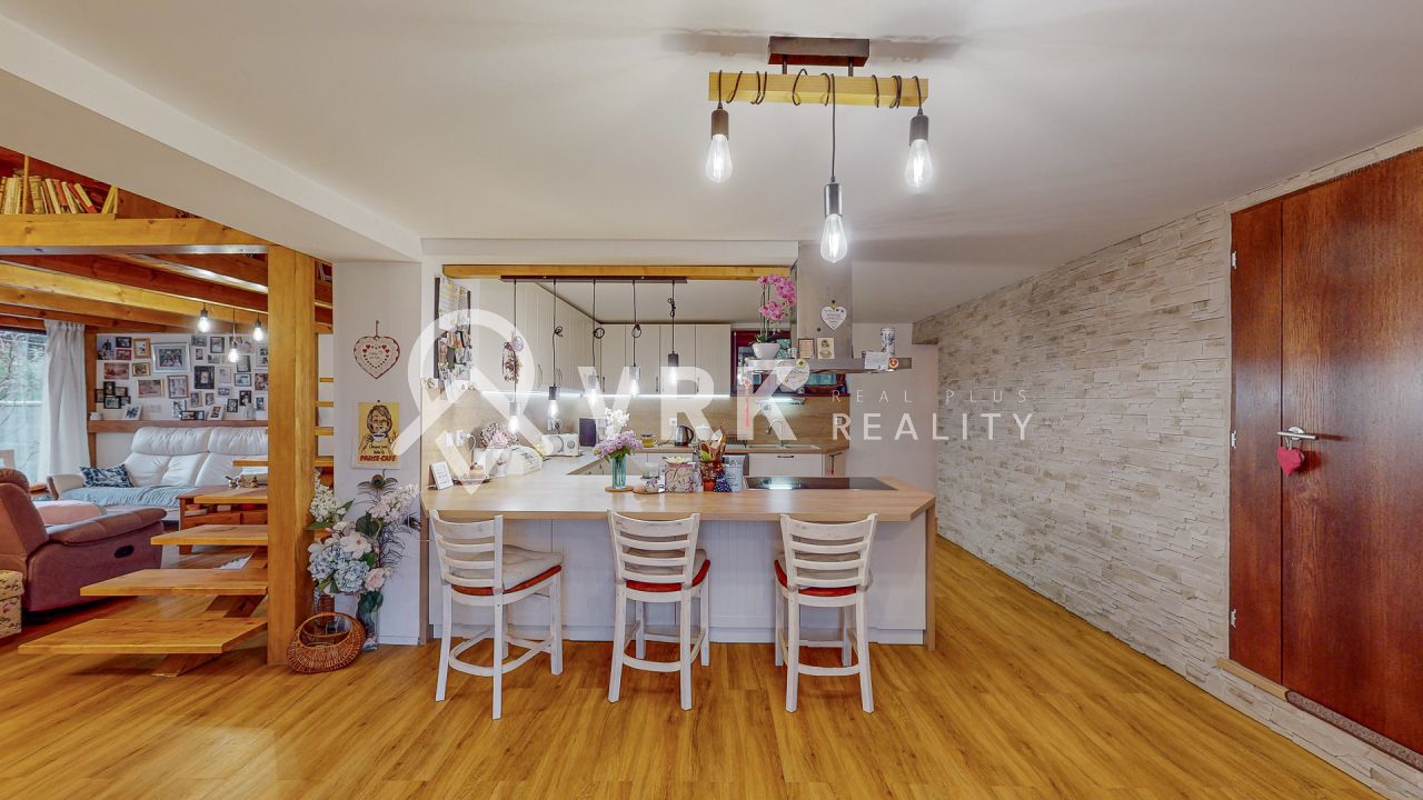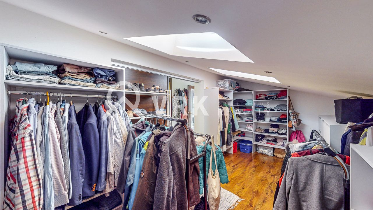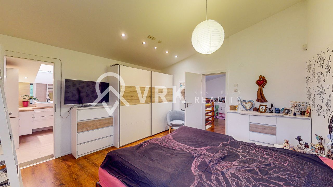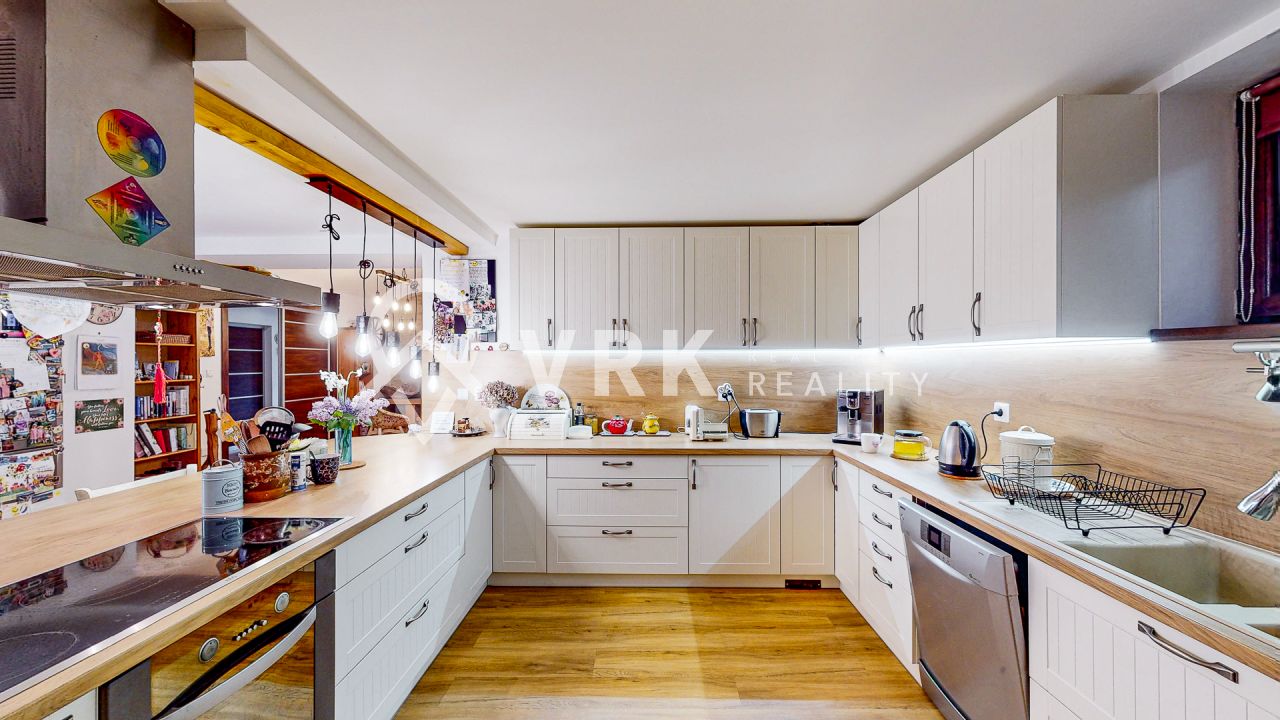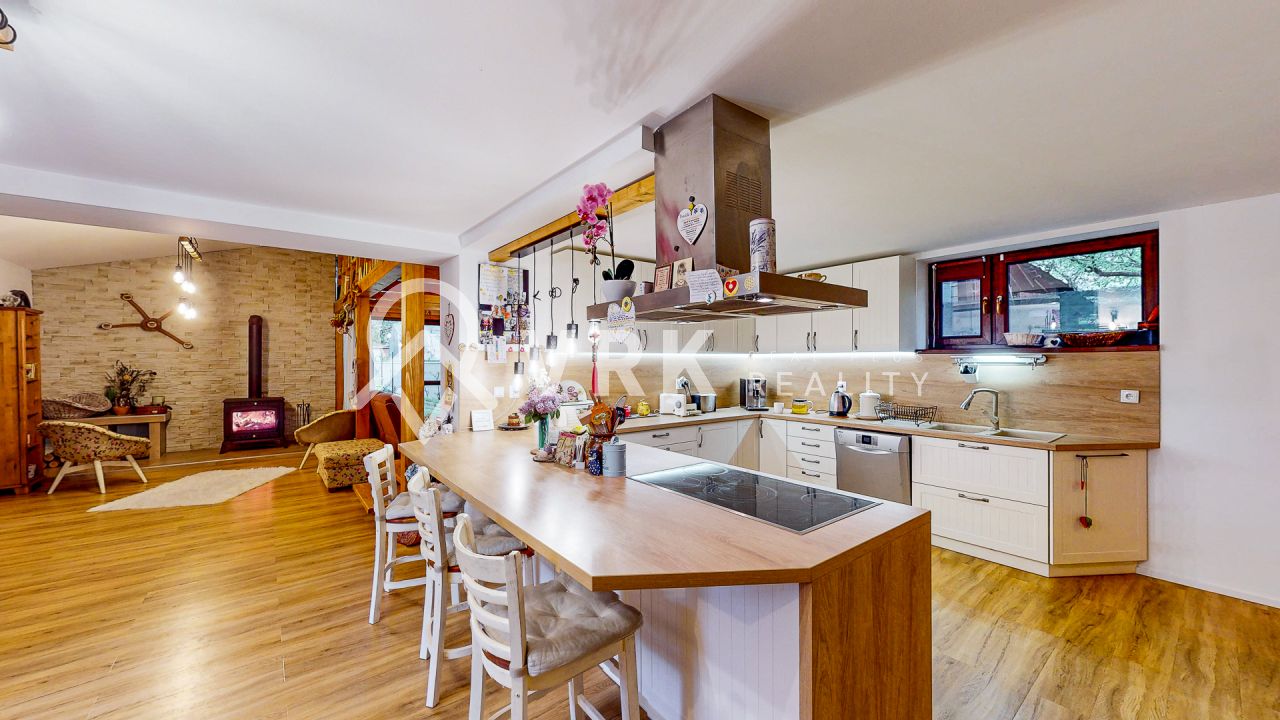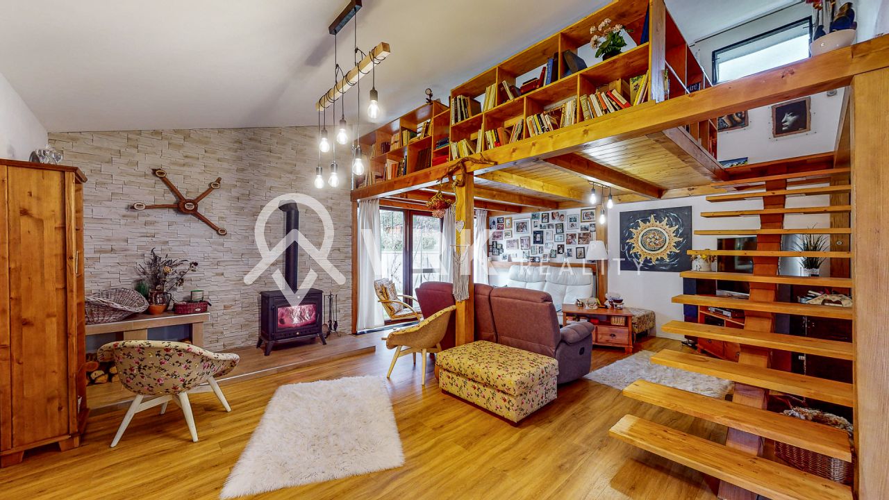 prízemie: sklad, šatník, chodba, obývačka s kuchyňou v ktorej sa nachádza na mieru robená kuchynská linka so zabudovanými spotrebičmi, drevená galéria ( nachádza sa tu pracovňa), kúpeľňa s WC, špajza, detská izba a terasa s veľkorysou výmerou 75 m2,