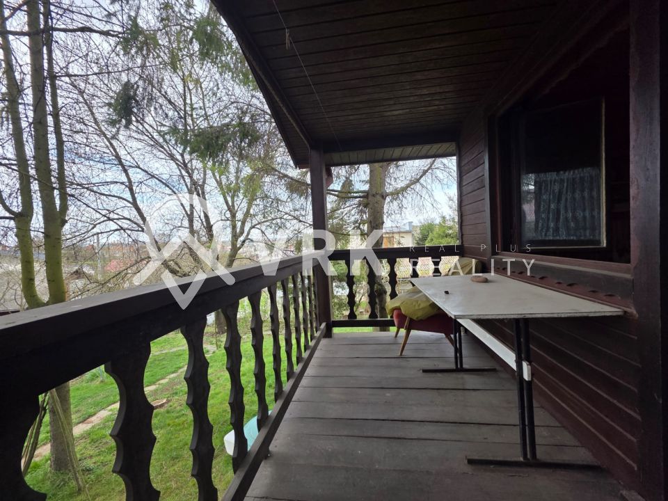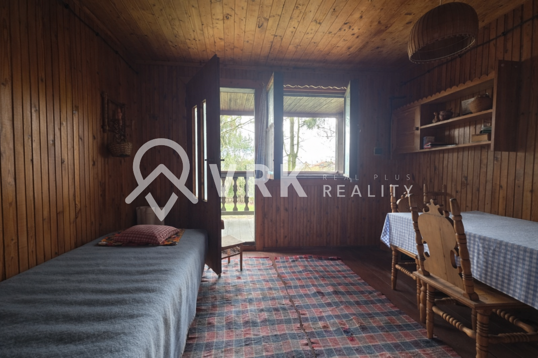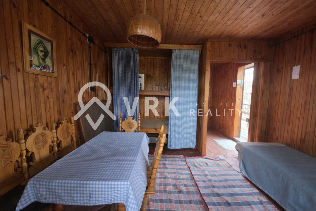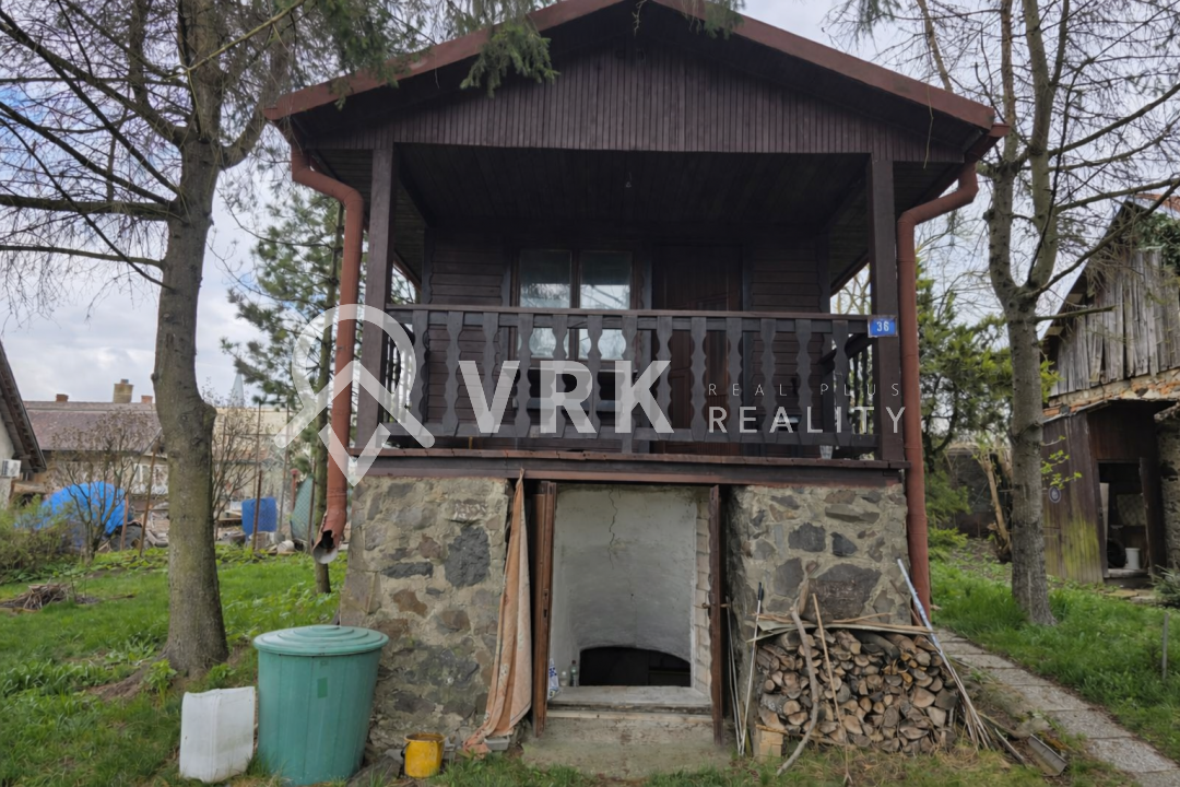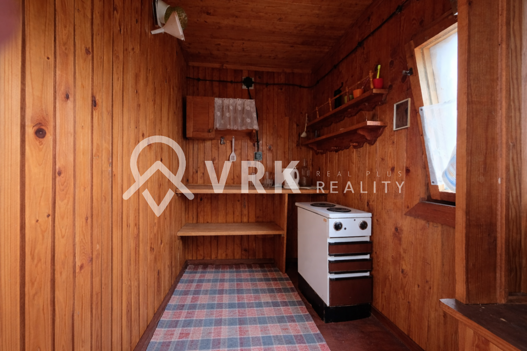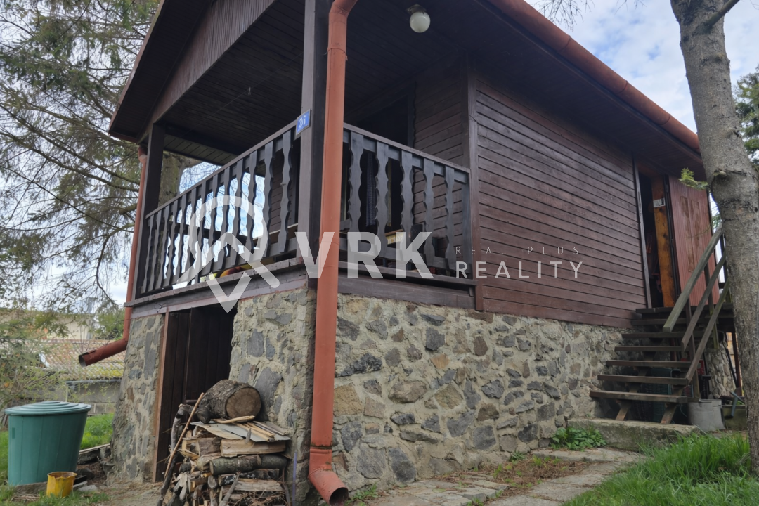 Na pozemku sa nachádza udržiavaná drevená chatka s murovaným základom a pivnicou, ktorá môže slúžiť ako zázemie počas výstavby alebo na dočasné bývanie.